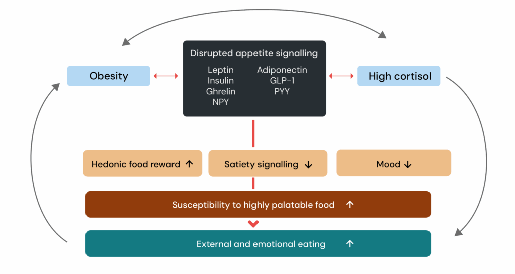 Kuckuck and colleagues reinforced this perspective in their review on stress, eating, and obesity, arguing that cortisol’s primary influence occurs through its effects on appetite-regulating hormones, such as leptin, insulin, ghrelin, and NPY. As a result, you’re more likely to feel hungrier, crave calorie-dense foods, and lose the normal satiety response that tells you you’ve eaten enough. 16