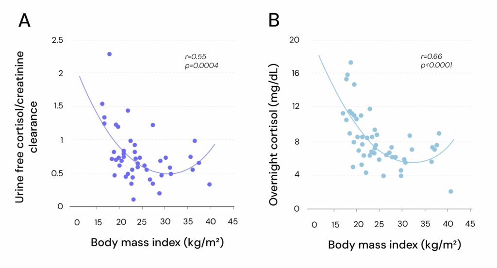 If it were as simple as cortisol causes people to gain fat, we’d expect a straightforward relationship: the more body fat, the higher the cortisol, right? But it’s more complicated than that.