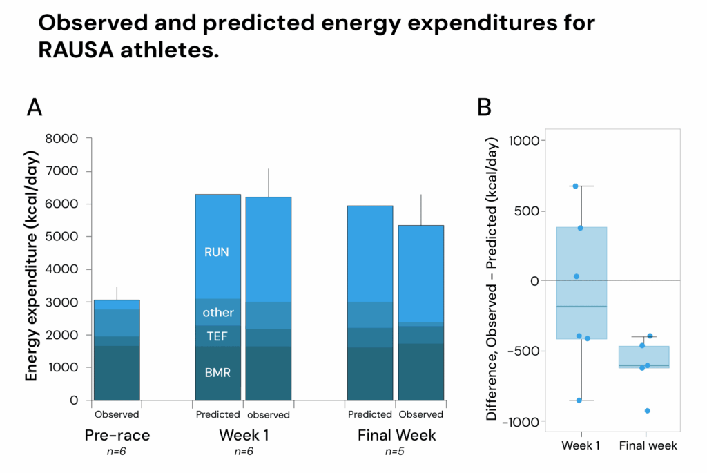 - In a 2019 paper, researchers studied six runners (five men and one woman) who ran six days per week for 20 weeks, completing a ~3100-mile race across the USA. At the start of the race, their total energy expenditure was elevated to approximately 6200 calories, within ~2% of the predicted value. But by week 20, their actual total energy expenditure had significantly decreased by 20%, settling around 4900 calories/day. This notable reduction highlights the body’s constraint mechanisms, limiting total energy expenditure during prolonged periods of high activity.