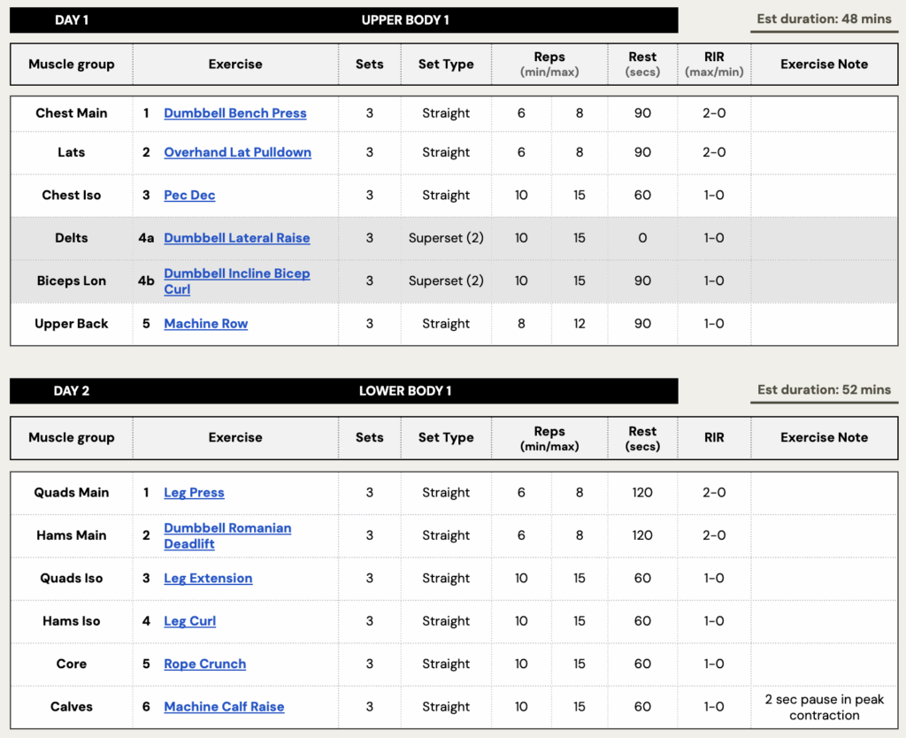 As for Joe’s training, he preferred a simple upper/lower split and could train four times a week. Joe noted that his “butt had pancaked” when he’d previously cut, and wanted to get that shape back. So the program was designed with that in mind, with the second lower-body day focusing on glutes. This is what Joe’s program looked like over the week: