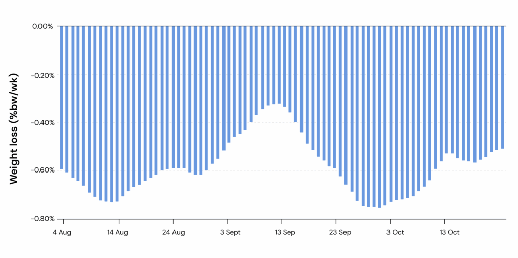 I was also fine with his rate of loss occasionally dropping below the 0.5-0.7% target as long as we were seeing progress elsewhere. Take a look at the chart below showing Joe’s weekly weight loss as a percentage of body weight over the last three months.