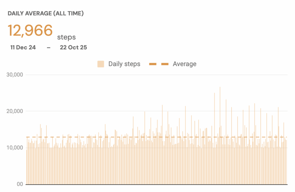 He’s only missed two workouts (because he was sick), and averaged ~13,000 steps each day.