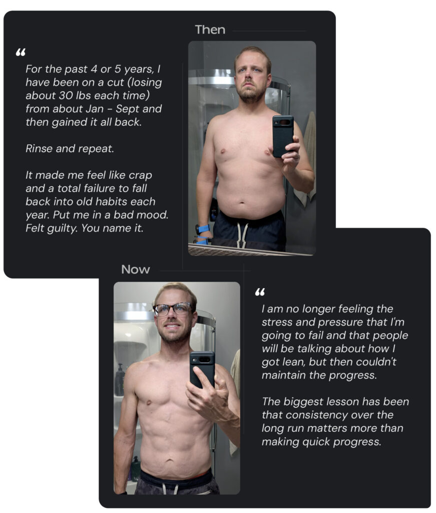 After years of cutting, rebounding, and redoing the same diet, Joe finally figured out what it takes to make progress that actually lasts. Read his case study to see how he did it.