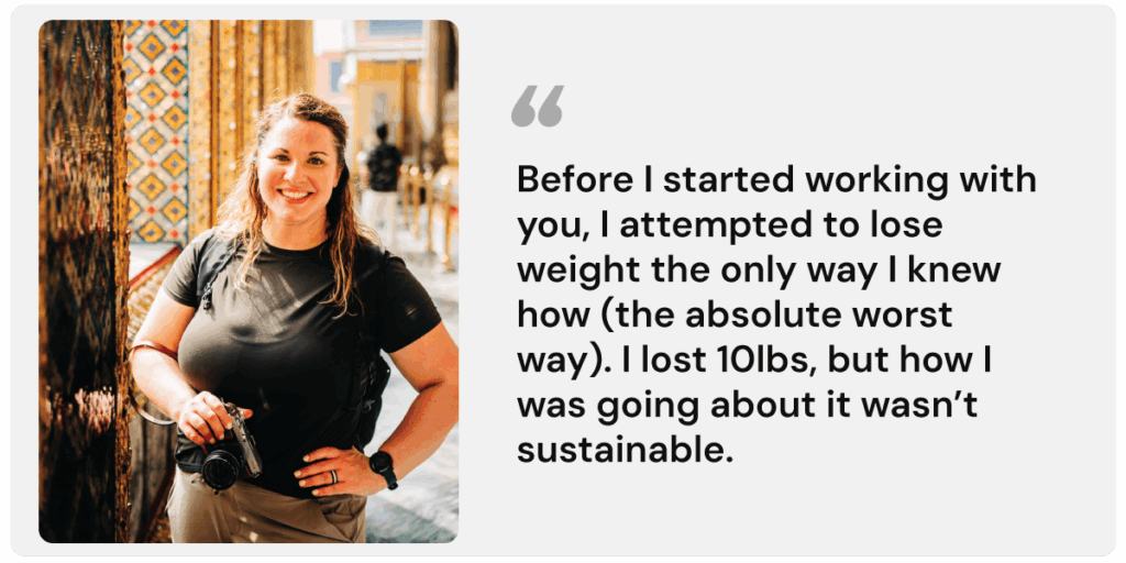 Overall, I am almost down 80lbs from my highest weight. Before I started working with you, I attempted to lose weight the only way I knew how (the absolute worst way). I lost 10lbs but how I was going about it wasn’t sustainable. That’s when I came to you. Even though it’s ~70lb lost with you, it’s ~80lb lost for me. And honestly, I can’t believe it. I’m still shocked I’ve come this far.