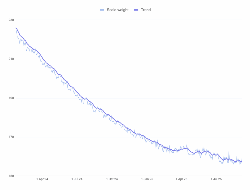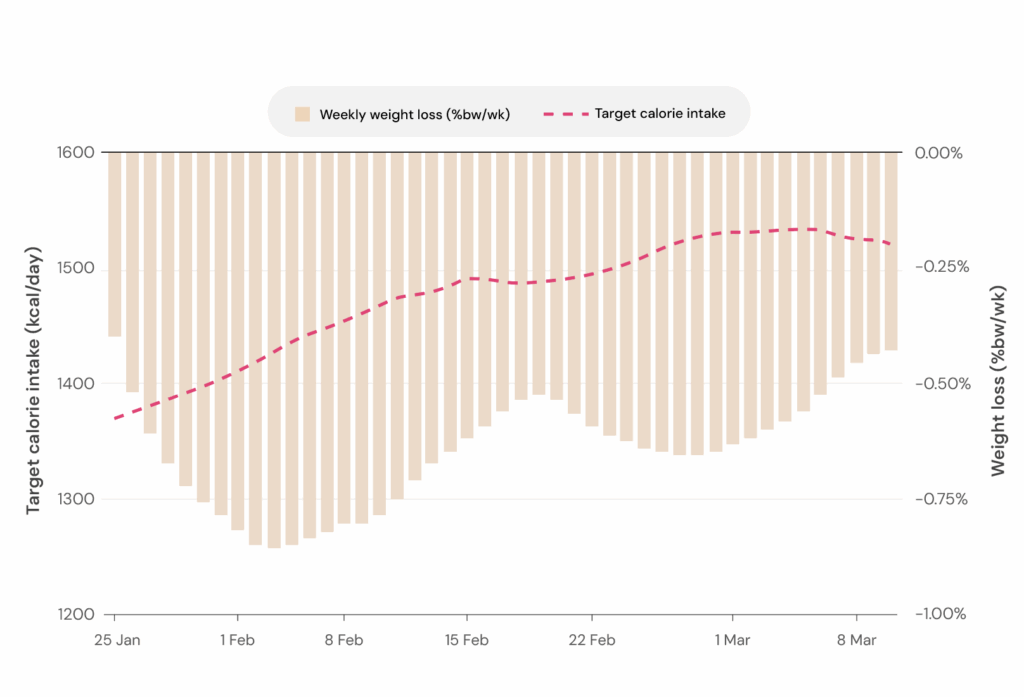 Over the next few weeks, I gradually adjusted her intake upward until her rate of loss stabilised between 0.5-0.7% of her body weight per week. By this point, Lauren was averaging around 1,500 calories while continuing to make progress.