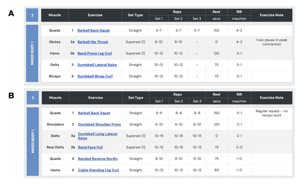 Her initial program was deliberately simple. From there, I gradually increased training volume and intensity over time. The image below shows one of Lauren’s workouts from her first program (A), compared to her most recent one (B).