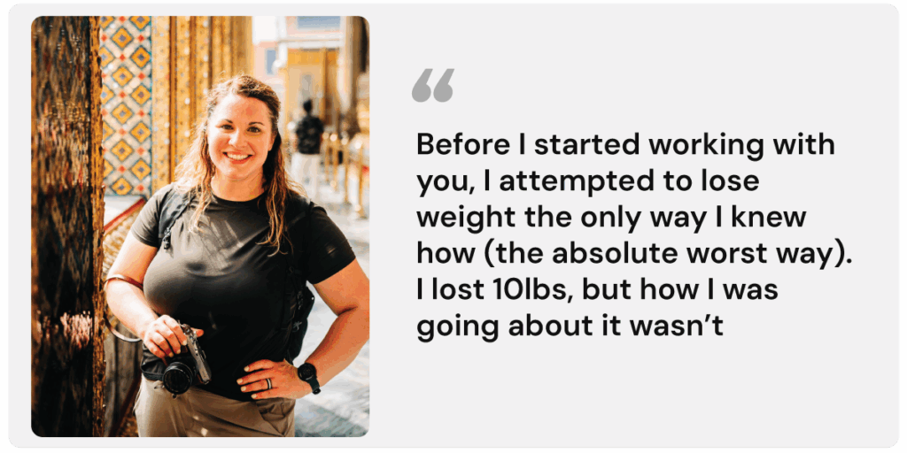 Overall, I am almost down 80lbs from my highest weight. Before I started working with you, I attempted to lose weight the only way I knew how (the absolute worst way). I lost 10lbs but how I was going about it wasn’t sustainable. That’s when I came to you. Even though it’s ~70lb lost with you, it’s ~80lb lost for me. And honestly, I can’t believe it. I’m still shocked I’ve come this far.