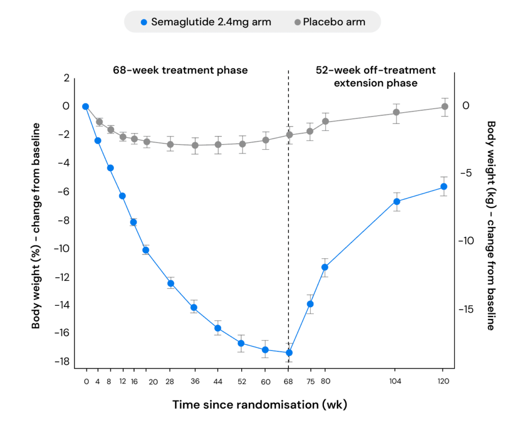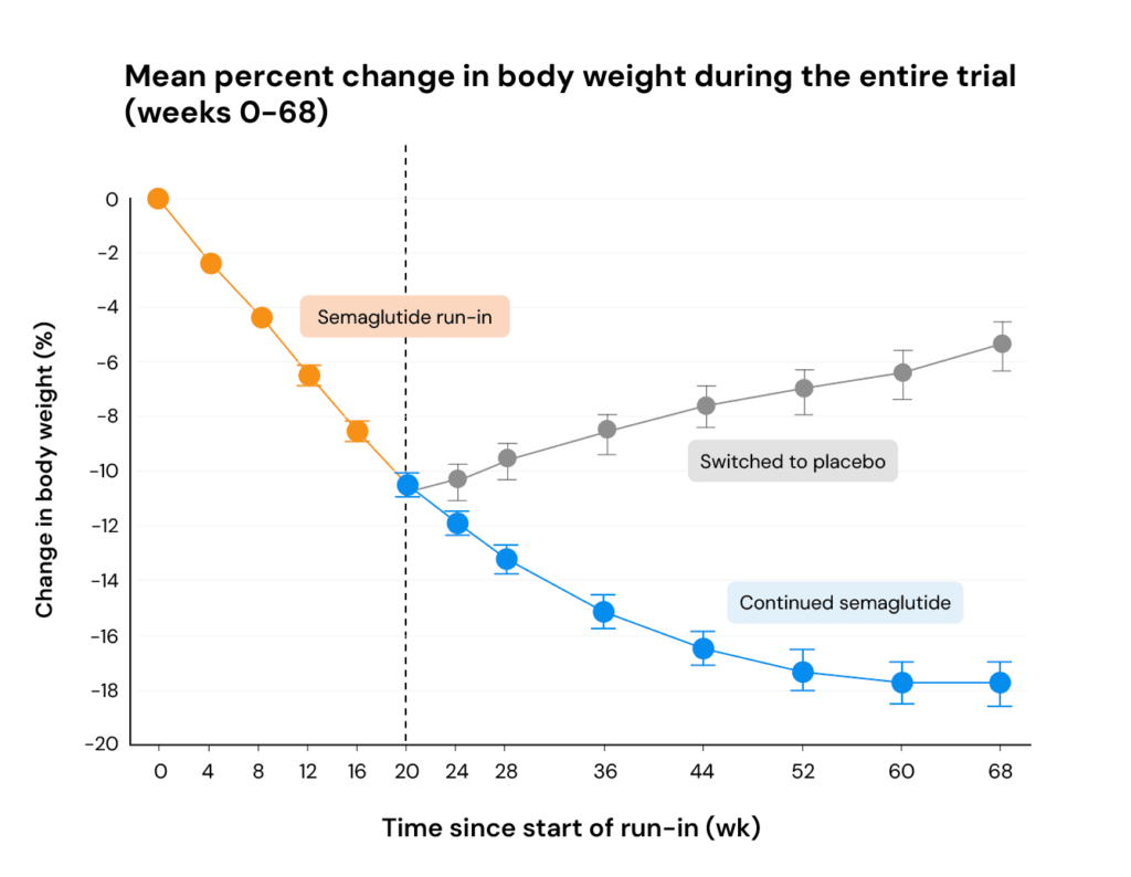 A separate trial compared what happened when participants continued using semaglutide versus switching to placebo, while both groups received identical lifestyle interventions. Those who switched to a placebo gained an average of 6.9% of body weight over the following 48 weeks, with more than 80% regaining weight.